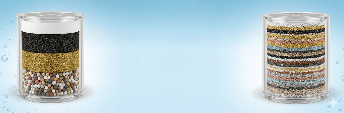 Many shower filters advertise 15–20–25 filtration stages. While this sounds impressive, dividing filtration materials into many layers often means each material is used in very small quantities. Instead of focusing on the number of layers, we focused on the amount of effective filtration media.